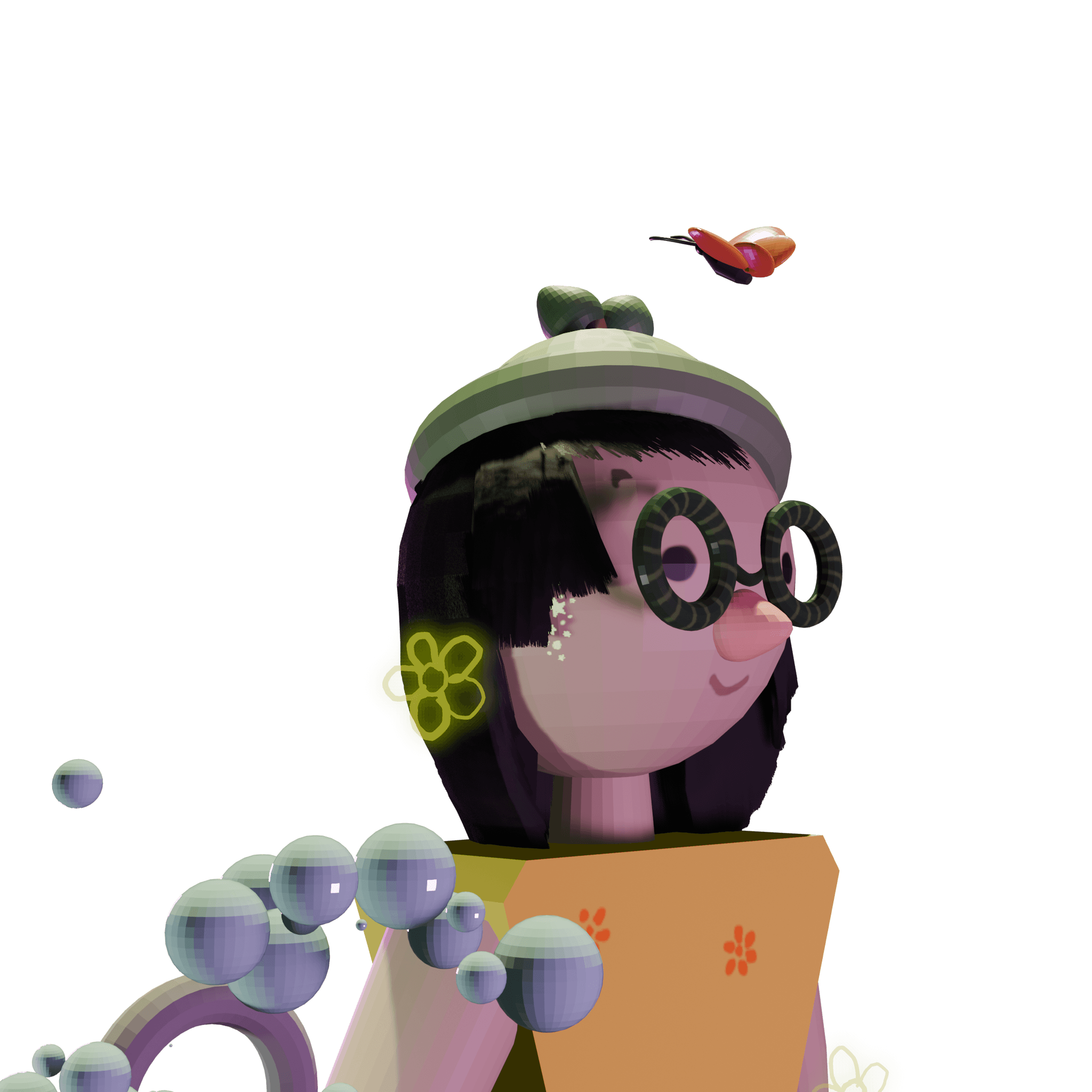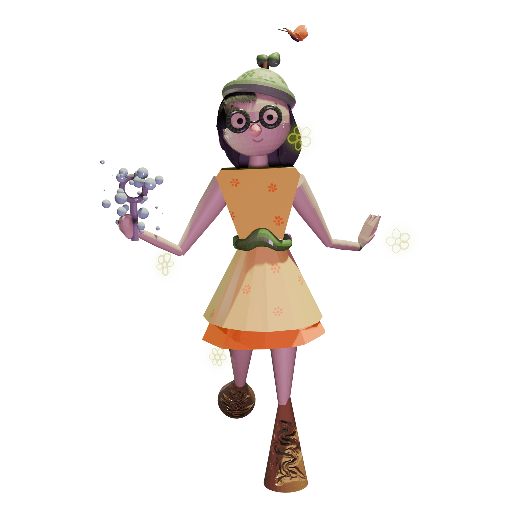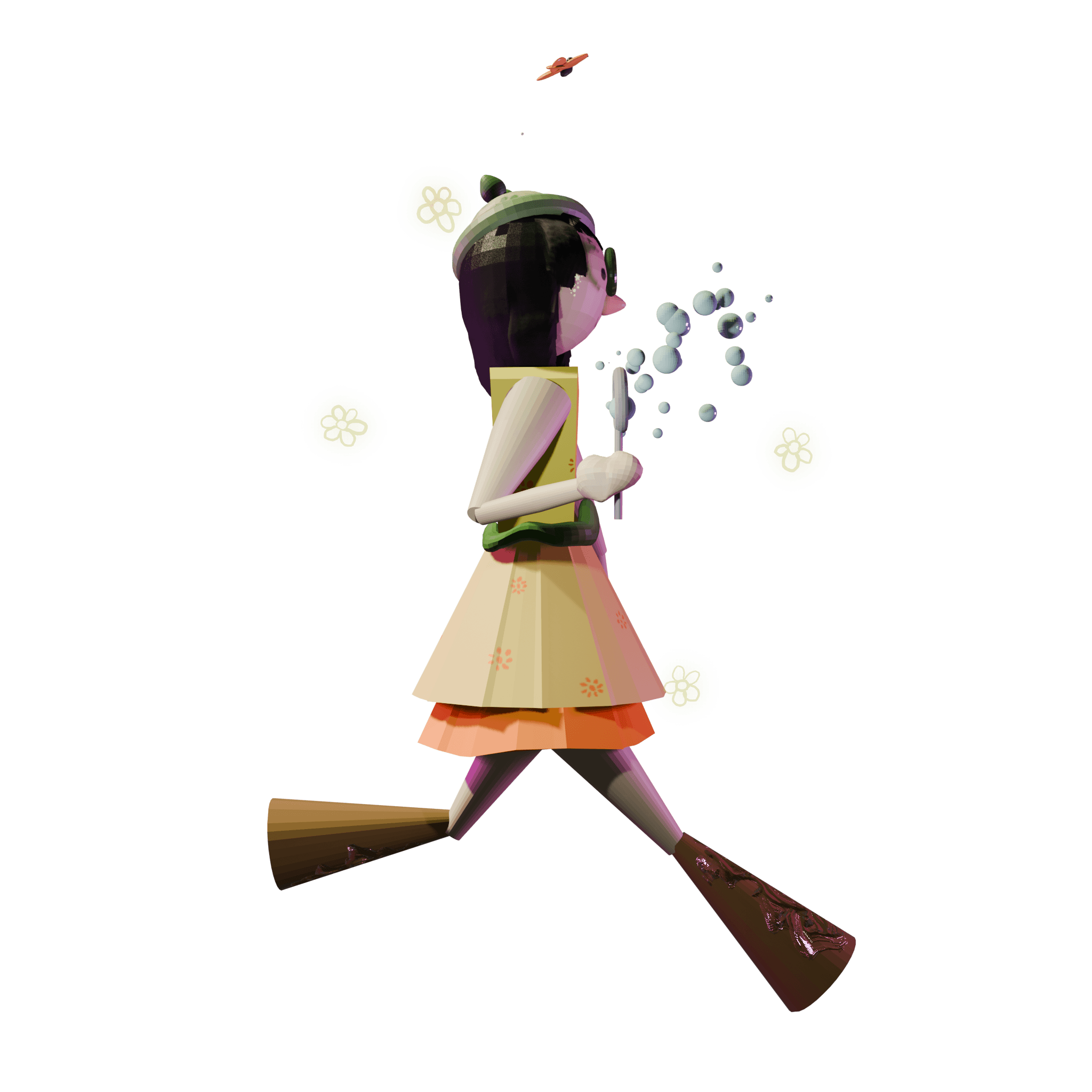 I thought of all the things which make a character look happy. Since childhood depicts happiness better, I made a girl frolicking around. I used bright yellow for her frock. I explored the hair and bubble particles along with grease pencil.